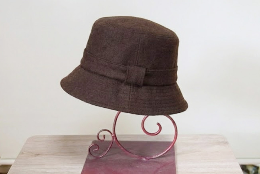 素材とディティール:ウールのフラノで温かみを。ブリムの部分にだけ多めにステッチ(ミシン目)を入れて、既製品のような高級感のあるしっかり感を演出します。